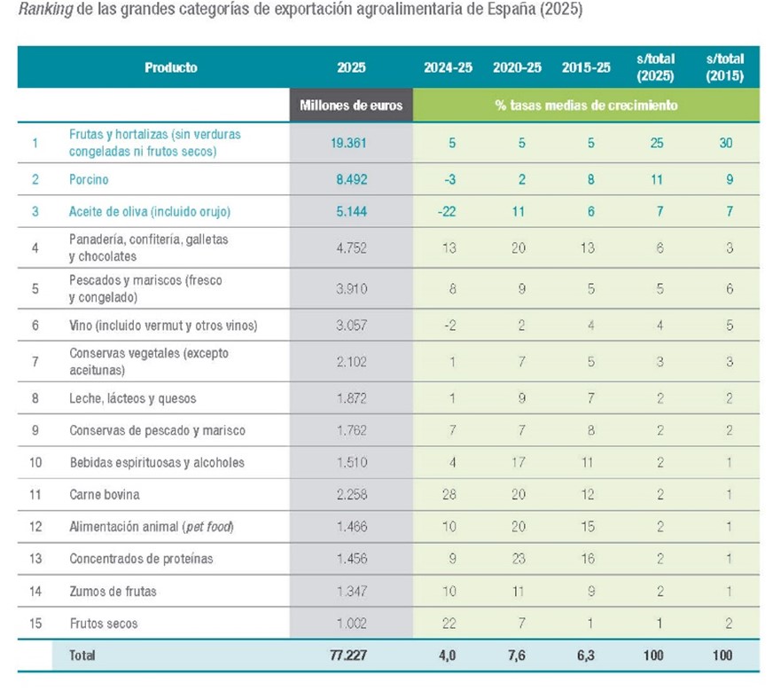 - Las exportaciones agroalimentarias españolas alcanzaron un nuevo máximo histórico de 77.227 millones de euros, con un crecimiento del 4 % en valor.
