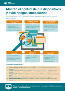 Otra práctica esencial es asegurarse de que los dispositivos estén configurados para activar un bloqueo automático cuando no se utilicen. Este simple mecanismo constituye una primera línea de defensa ante intentos de acceso no autorizado, impidiendo que personas no autorizadas puedan acceder a la información incluso si tienen el dispositivo físicamente en sus manos. Del mismo modo, al concluir la jornada laboral o en períodos prolongados de inactividad, es recomendable guardar los dispositivos en lugares seguros y protegidos para evitar riesgos adicionales, como robos o manipulaciones.